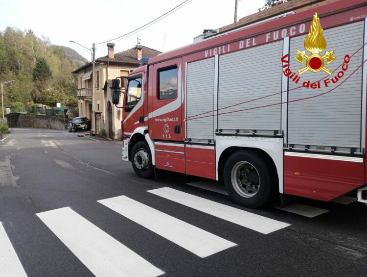 Incidente a Dumenza: auto urta palo della luce e muro. Vigili del Fuoco chiudono via Roma per precauzione