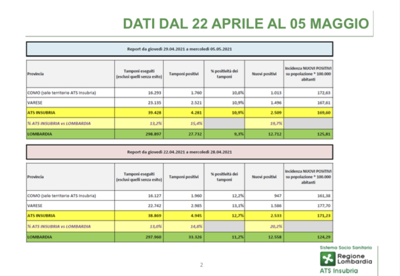 I numeri diffusi da Ats Insubria evidenziano una continua diminuzione dei contagi. Stabile l’indice Rdt, fermo sotto l’uno