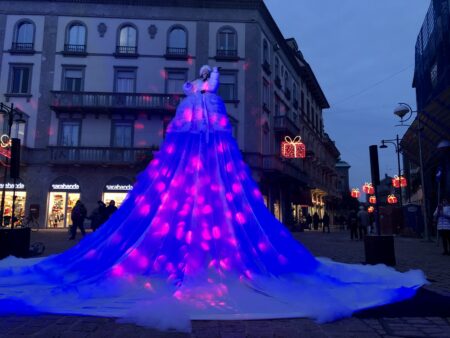 L’esibizione della dama violino alta 4 metri incanta il centro di Busto