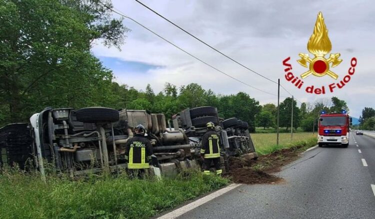 Comabbio: Tir carico di cemento si ribalta sulla 629