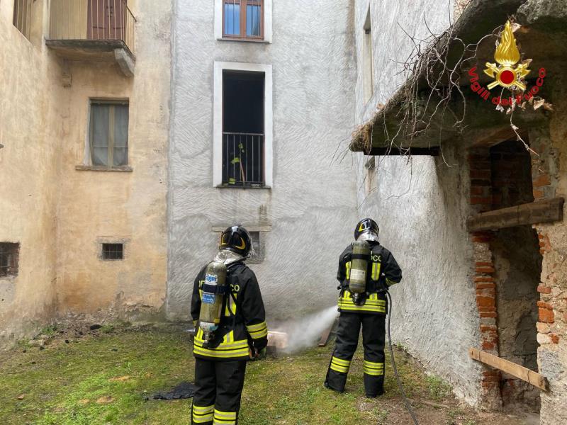 Fiamme a Castello Cabiaglio: un ferito. Vigili del Fuoco in azione in una corte di via Matteotti