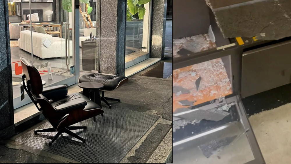 Spaccata notturna al negozio di arredamenti Rigolio a Gallarate, vetrina rotta, danni e furto di una poltrona di design