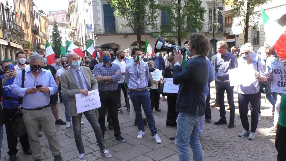 Il flashmob organizzato a Varese dalle forze che guidano Regione Lombardia si è rivelato ben più accorto rispetto a quello romano, con accessi limitati, mascherine e distanze di sicurezza. Cartelli contro l’esecutivo. Tra i più acclamati, il luinese Pellicini (FdI)