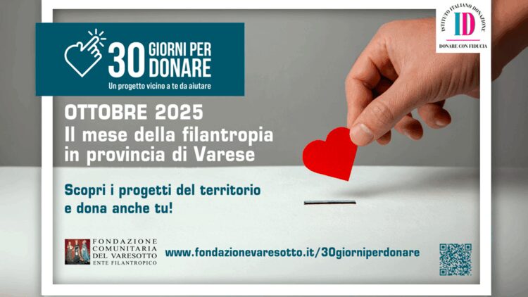 Ottobre sarà ancora una volta il mese del dono nel Varesotto. Dal 1° al 31 ottobre torna “30 giorni per donare”, l’iniziativa promossa dalla Fondazione Comunitaria del Varesotto che unisce enti, cittadini e imprese in un grande percorso di solidarietà. Giunta alla terza edizione, la manifestazione coinvolgerà quest’anno 39 enti con l’obiettivo di raccogliere e raddoppiare le donazioni fino a 100mila euro complessivi.