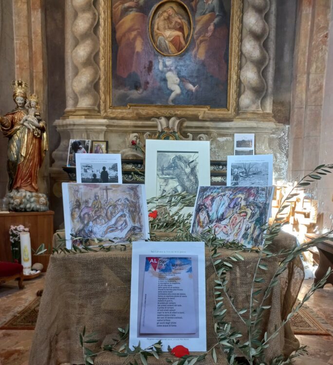 È una meditazione intensa, quella proposta per la settimana Santa, dal Comitato Amici del Tempio Civico di Busto, centro di educazione permanente alla pace, che trasforma la chiesetta settecentesca in un luogo di riflessione e commozione. Accanto alle riproduzione dei dipinti del pittore Carlo Farioli, (messe a disposizione dallo Spazio Arte Farioli,) le immagini di bambini tra le macerie ricordano la devastazione quotidiana vissuta dai più piccoli, costretti a crescere in contesti di violenza. Sulla Croce con Cristo le vittime innocenti dei conflitti che continuano nel mondo. “Cristo, Re della pace, grida ancora dalla sua croce: Dio è amore! Abbiate pietà! Deponete le armi, ricordatevi che siete fratelli!”. Ha detto Papa Leone XIV.