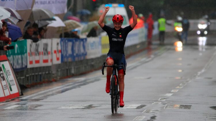 Sul podio baganto di via Sacco ha alzato le braccia al cielo Cedrine Kerbaol per la Tre Valli femminile
